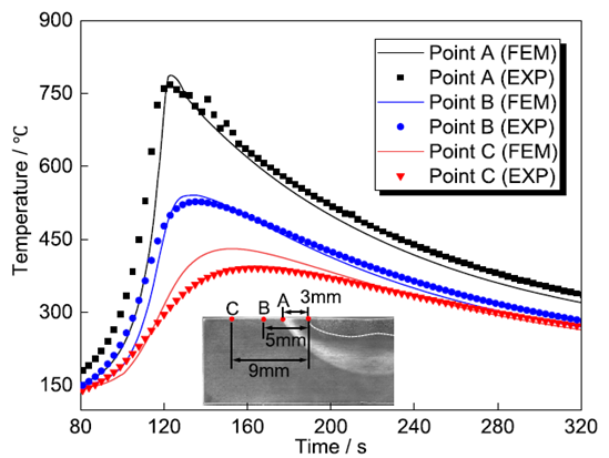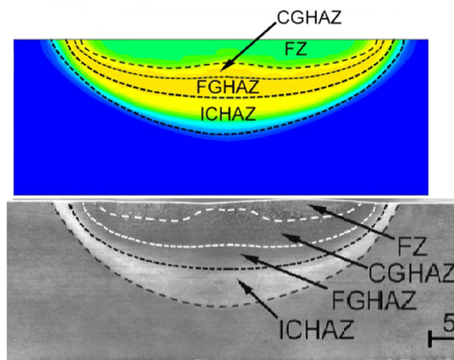 1、温度场预测 仿真得到的温度场与实验测量结果高度一致,表明软件能够准确捕捉焊接过程中的热传导和热对流行为。这一结果为后续的微观结构和残余应力预测提供了坚实的基础。