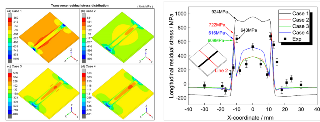 通过引入相变动力学模型,软件能够准确预测焊接接头的相体积分数分布,与实验观察结果吻合良好。重庆大学的研究团队通过人工修正SH-CCT图,进一步提高了模拟结果的准确性,为实际工程应用提供了可靠的参考。 3、残余应力预测 仿真结果表明,固态相变对焊接残余应力的分布和大小有显著影响,而软化效应则能够降低软化区的纵向残余应力峰值。这些结论为优化焊接工艺提供了重要的理论依据,有助于提高焊接接头的性能和寿命。
