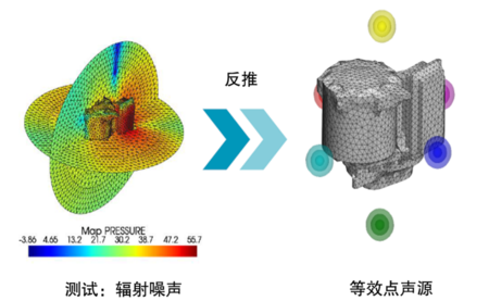 图3 等效点声源识别 以上各种声源识别方法都能帮助仿真工程师构建从声源定义到振动噪声传播路径模拟再到响应计算的完整流程。上述流程中,也可以使用仿真得到的振动或者噪声结果进行等效声源的推导。