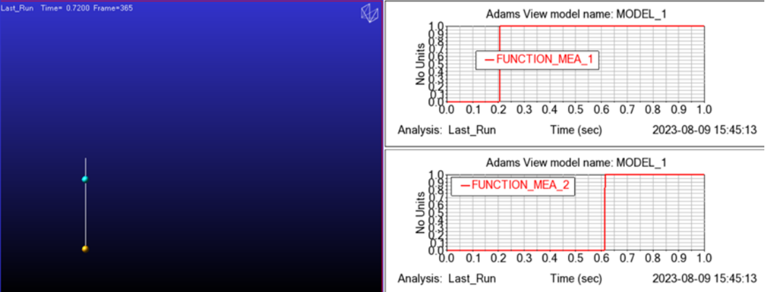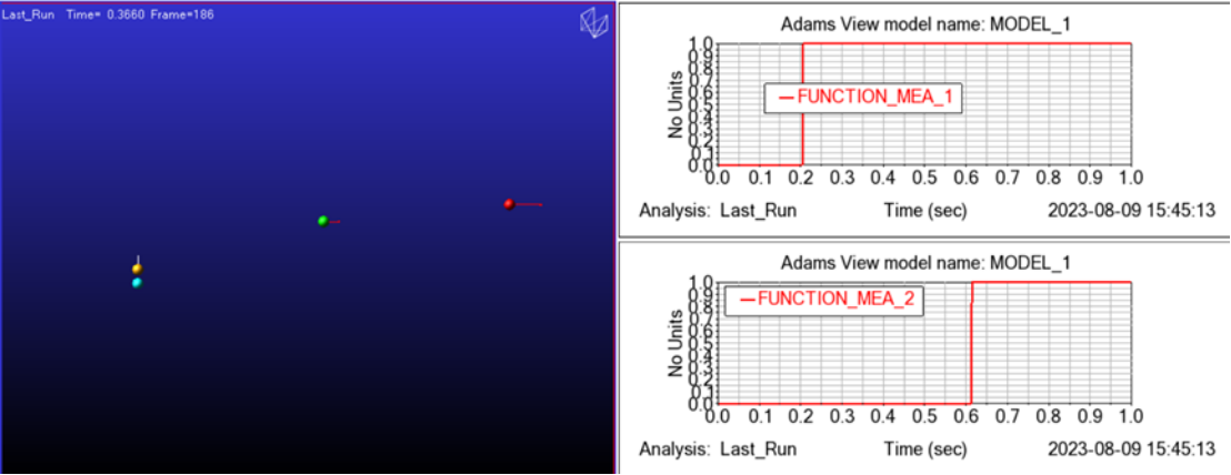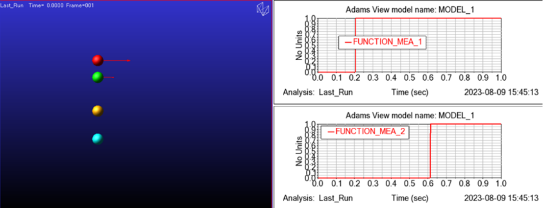 图7 0时刻动画 上图展示初始状态动画,红色球上施加200N载荷,绿色球上施加100N载荷,分别沿水平方向加速运动,当红色球达到10米每秒速度时sensor_1触发,当绿色球达到15米每秒速度时sensor_2触发,可以观察右侧曲线为各自触发的时刻。
