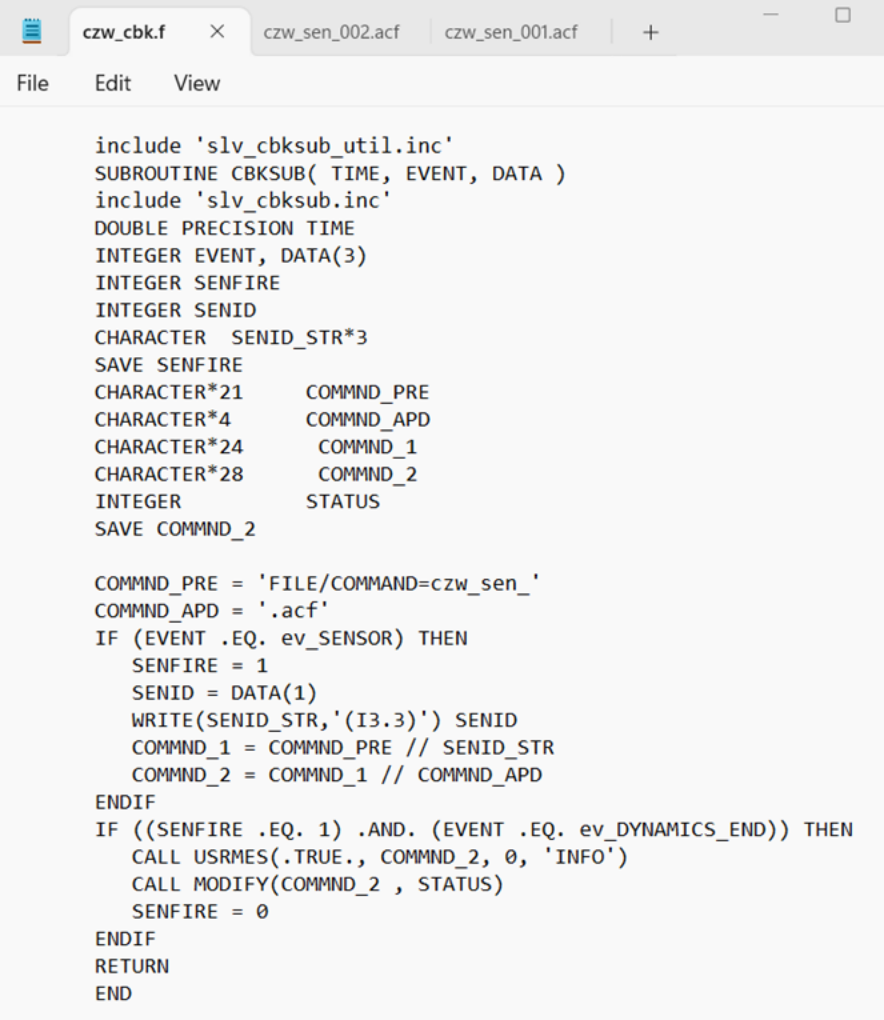 图1回调子程序源代码 本程序的基本逻辑是,当回调函数遇到传感器触发事件发生时,首先会进行命令字符串的构建,然后将命令传递给Modify函数,Consub可以调用Modify,在执行了Modify发出的命令后,程序控制返回到Consub,关于Consub调用Modify的机制这里不展开。但这里需要注意一个使用特点,Adams/Solver会忽略命令末尾5个空格之后的部分,因此,当使用字符功能构建命令时,需要注意将多余的空格去掉。 对于上述逻辑,如果不想对源代码有过多的认识,只需要考虑后面的使用流程就可以,核心思想是每个sensor对应一个Acf文件,在Acf文件中有相关的命令,当传感器触发事件发生后,程序会将该传感器的ID传输到Data数组中,然后,命令字符串的构建会综合这个ID,这样就形成了那个sensor触发,执行对应的Acf文件的目的。具体流程如下: