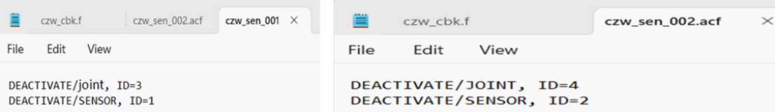 图6Acf文件定义 定义该文件需要注意其名称以及同sensor的ID号之间的联系,这个在源程序中以有过说明。实现的目的,当sensor_1触发后将3号joint抑制,也即part_c小球之后会自由落体;当sensor_2触发后将4号joint抑制,也即part_d小球之后会自由落体。当然,将各自的sensor在触发后关闭。 提交仿真,可以使用交互式仿真也可以使用脚本计算,但是如果使用脚本计算要注意不能再有对传感器的操作,因为本案例找的就是传感器触发事件。