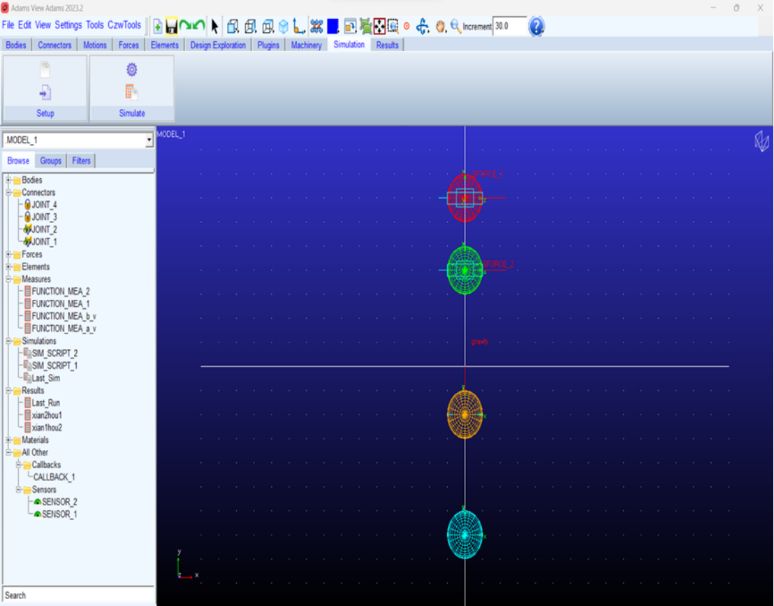 图9 Sensor_2触发动画 同样地,等到sensor_2也触发后,靓色球体与大地之间的固定副解锁,可参考sensor_2对应的Acf命令,将Joint_4抑制,靓色球在重力作用下自由落体,其已经运动并且有轨迹,但是当前两个球的轨迹重合。 04文章总结 通过利用回调函数子程序的功能,拾取传感器触发事件,通过编程将每个传感器触发对应的命令选择执行,实现了多个传感器存在情况下,触发次序无关的需求。通过上述流程说明和实例展示,该方法非常简单有效,适合实际工程所需。并且,可以面对交互式仿真或者脚本仿真使用,应用范围较广,可解决这类较复杂工况问题,为多体动力学的变拓扑分析提供了新的解决方法。