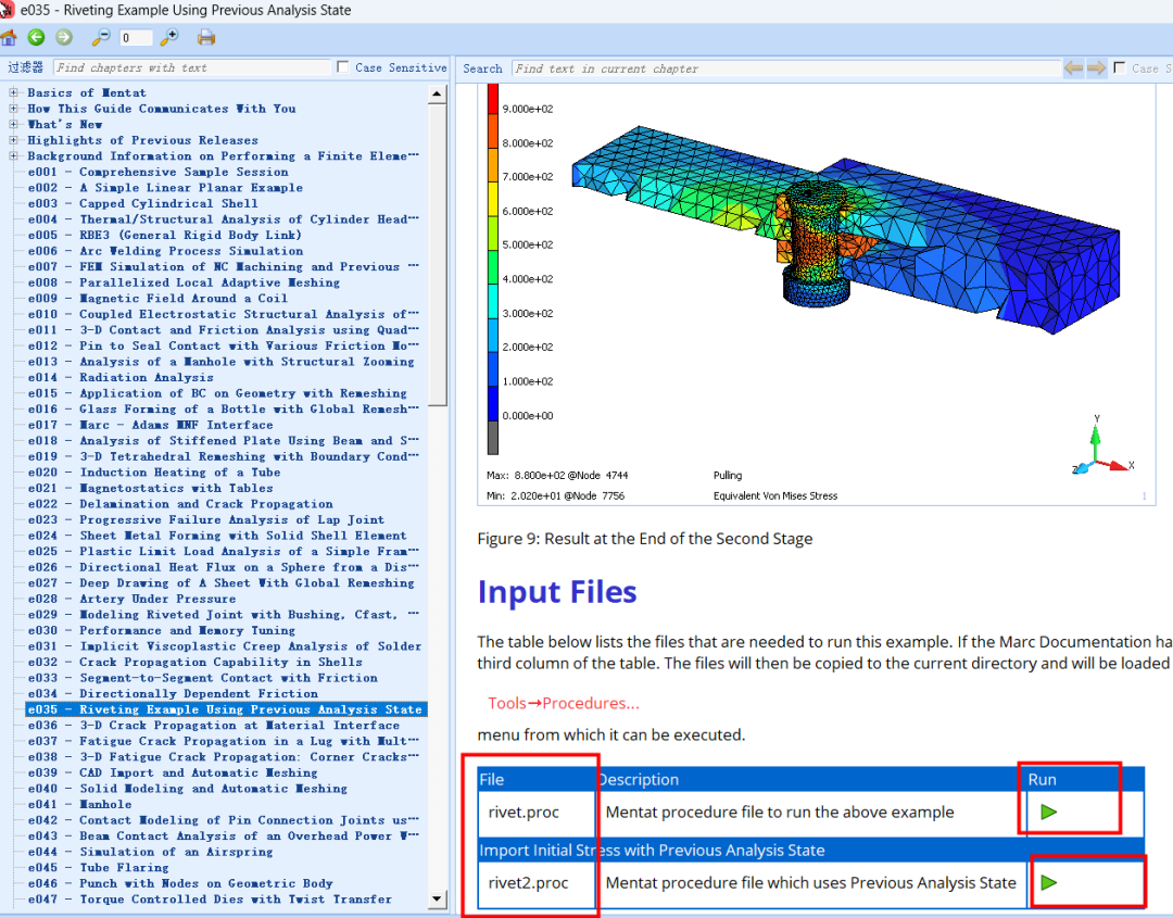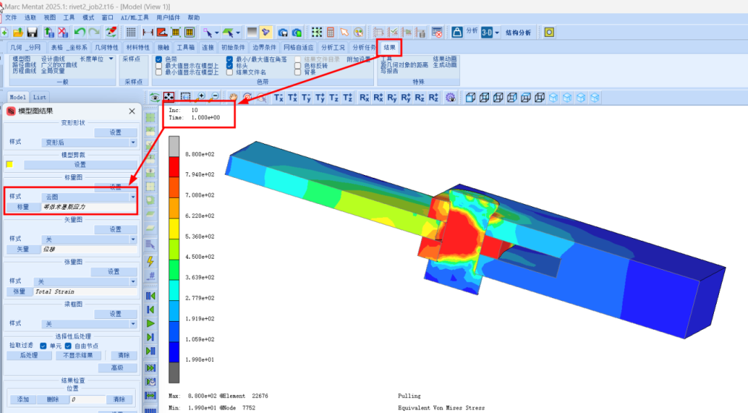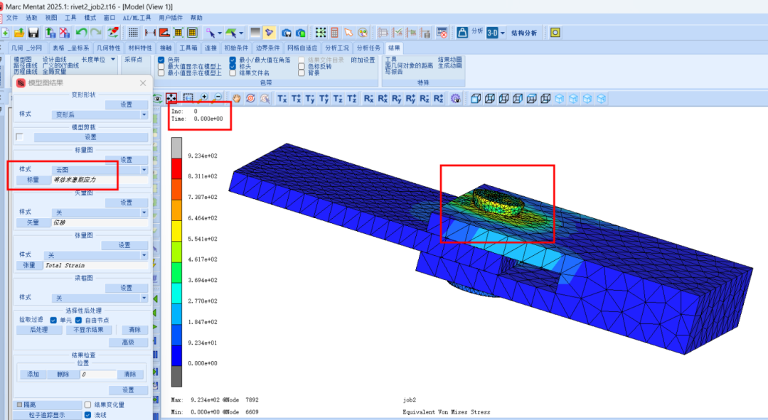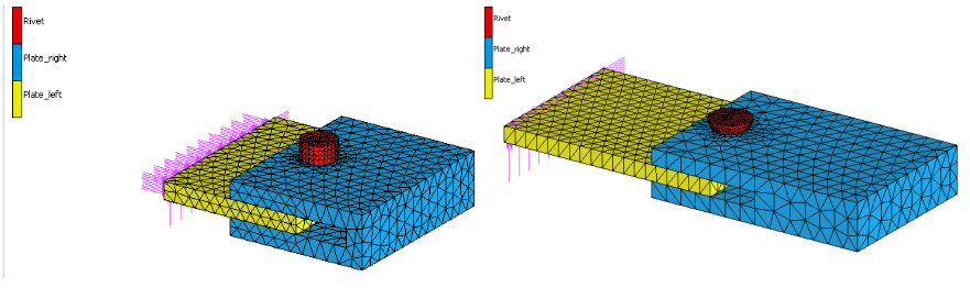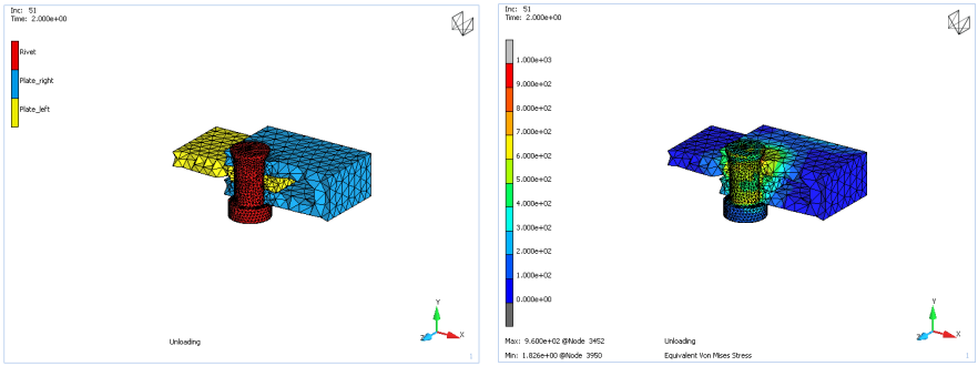 此示例展示了分析中使用先前分析状态的过程。示例的第一阶段执行铆接操作,将两个部件连接起来。此操作是在仅包含铆钉周围区域的较小模型上完成的。第二阶段将铆钉连接的两个零件拉伸增大成最大的零件,第一阶段模型相当于第二阶段模型的一部分,然后将先前分析状态的残余应力和应变状态映射到新的模型中。本示例的目标是展示新版本Marc在调用前分析状态的功能改进。