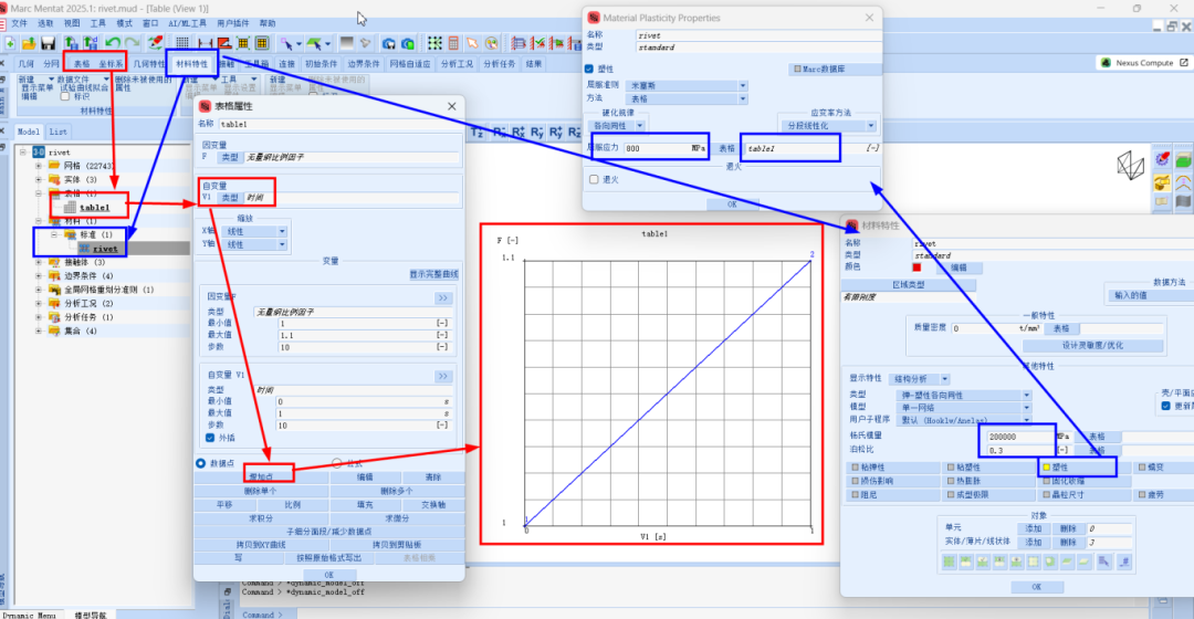 第一个模型相对简单,CAD中构建3个几何模型,进行网格划分,见图1。定义材料,设置模量,泊松比和塑性硬化曲线见图2。定义边界条件,板材两端被固定夹紧约束边界条件,2个板件通过铆钉连接在一起,确保在第二个模型中扩展时,不会位移跳跃;铆接过程通过将铆钉底部夹紧,并给铆钉顶部在y方向施加规定位移来简化建模,见图3。