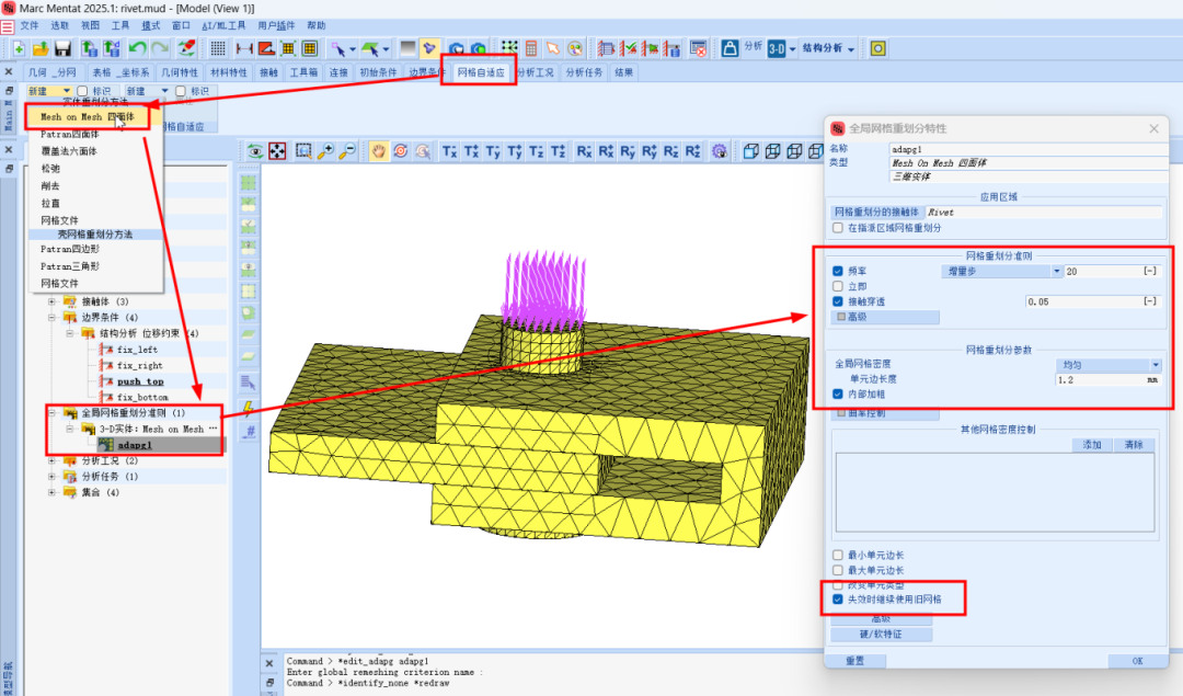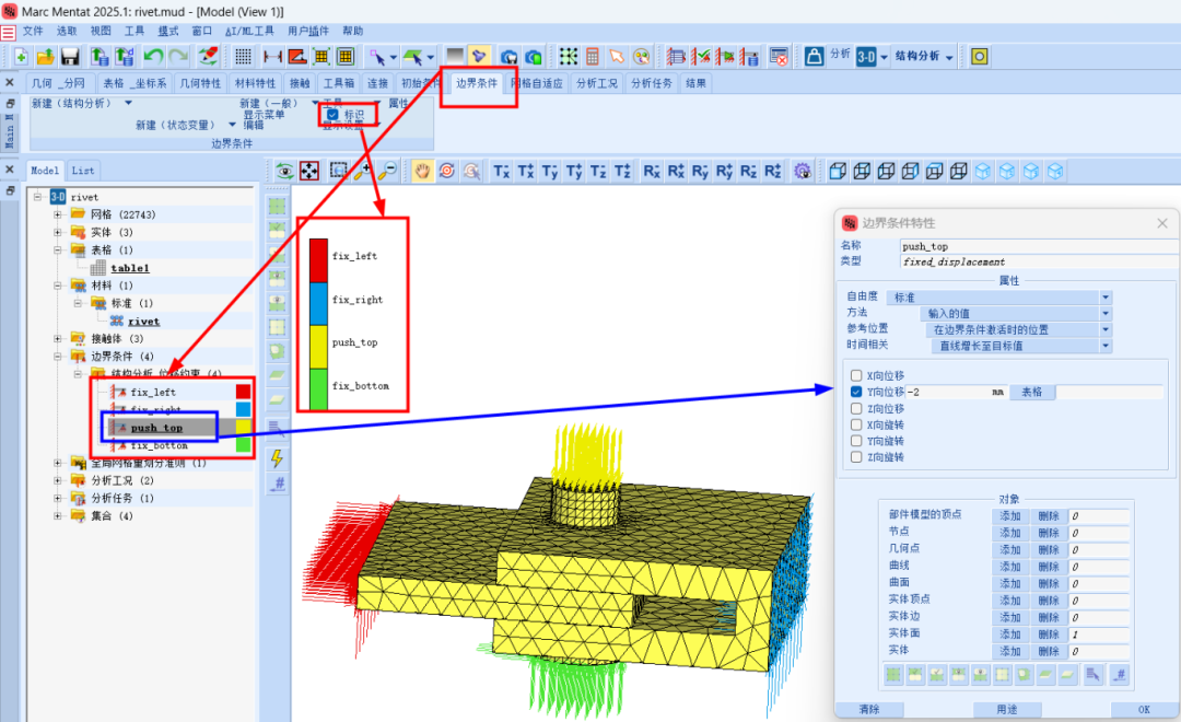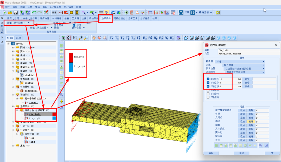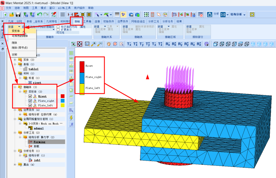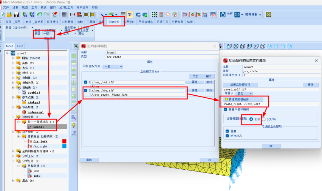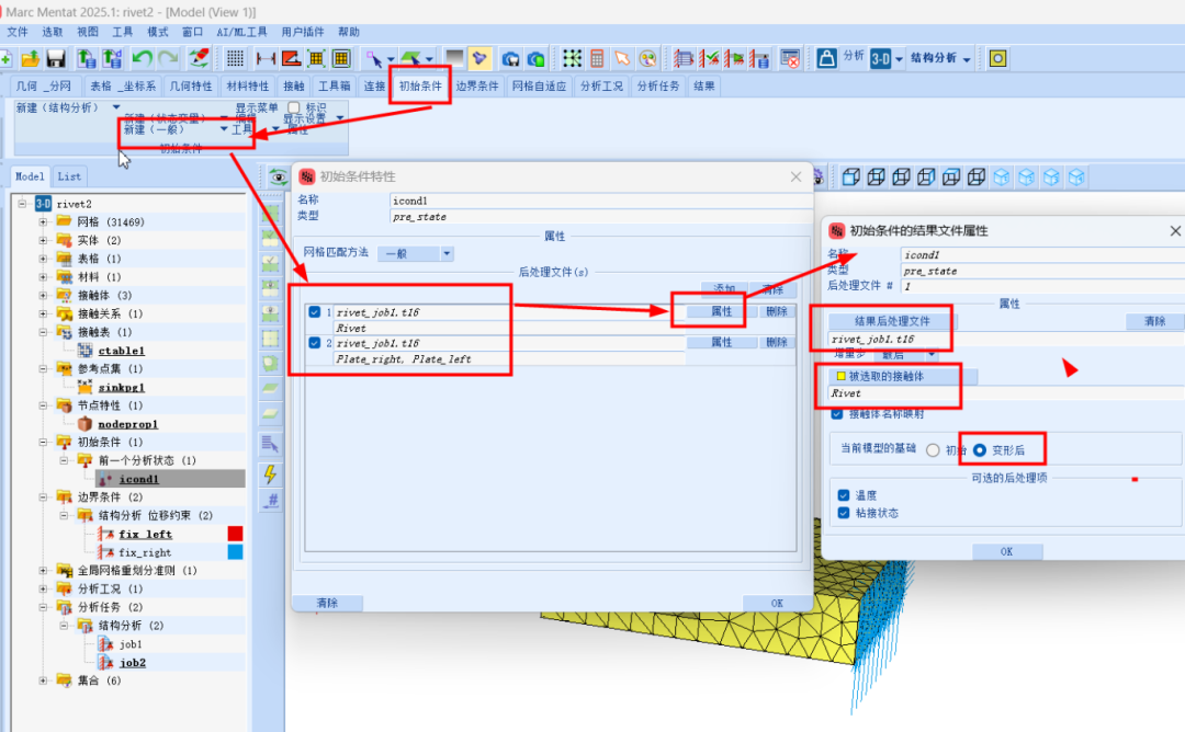 Marc 2025版本新增了许多实用功能,下面我们就通过具体的案例来进行解读。今天要分享的是调用前分析状态铆接实例,本示例着重介绍了在多个接触体参与且其中一个部件使用重网格的情况下,如何使用先前的分析状态。