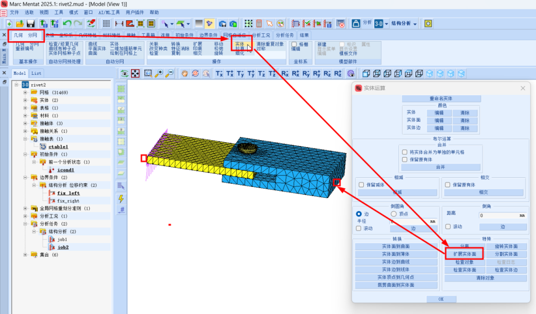 模型修改,第二模型使用第一阶段模型作为基础。铆钉替换为变形后的网格,板材被加长,其中包含铆钉及其周围的板材网格改变如图1所示,使用了 Solids Operation 中的 Expand Faces 选项,具体操作步骤如下所示。板材的两端扩展了30mm,并注意到在固体修改后,固体会自动重新划分网格。新的边界条件:一端被夹紧,另一端施加2mm的固定位移,拉开板材,以在铆钉上施加载荷,保持装配体的整体性。