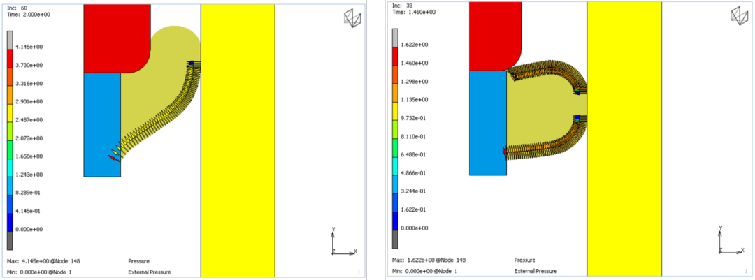 设计仿真 | Marc流体压力密封渗透功能来源:海克斯康 本文介绍了一种新的流体压力渗透分析方法。该功能捕捉了流体被压入橡胶密封圈和壳体间渗透效果,从而无需直接对流体进行建模。 该Marc仿真功能基于接触压力,并考虑了接触面渗入流体的影响。流体压力可以逐渐渗透到接触表面下方,以模拟流体在压力增加时的效果。 以下示例用于说明该过程。 如图2所示的D形密封圈首先在安装阶段被压缩,然后施加流体压力。压力载荷施加在密封圈的整个边界上,该边界表示最终可以施加压力的区域。在此过程中,压力在渗透之前不会激活。这意味着它暴露在流体中。定义了一个初始渗透点,以指定流体压力最初活跃的位置。从起点开始,通过沿边界注压直到接触区域或负载末端来找到湿区。当负载在负载箱中激活时,就会发生这种压力显示。然后,随着负载的增加,当接触应力低于用户定义的阈值时,渗透区将在接触区下方生长。这里有两个效果。首先,随着压力载荷的增加,密封圈会膨胀并增加接触压力。其次,压力载荷在接触下渗入,降低了接触压力。如果第二种效应更大,密封圈就会泄漏。此过程可以用Marc2024.2版本进行实现。 压力渗透的仿真探测过程: a) 施加预载荷,压缩橡胶密封圈; b) 在初始浸湿表面上施加载荷,暴露于油压时压力激活; c) 在部分渗透区域压力下降; d) 增加压力; e) 如果接触压力小于阈值; f)扩大渗透面 继续迭代,直到渗透表面压力达到最大面积,无法再继续渗透。 图3比较了两种情况,其中唯一区别密封圈和端盖接触面宽度差异性,及密封压缩量差异。接触面宽度越大,密封圈端面和端盖之间的间隙越小,密封效果越好。在第一幅图中,密封圈中的压力足够高,可以防止泄漏,但在第二幅图中间隙太大。在流体压力增加过程中,接触压力降至阈值以下,密封圈开始泄漏(流体压力在密封圈的两侧)。 图3:流体渗透分析结果对比 该案例可以参照Marc2024.2用户指南实例e134,帮助中对密封压力泄露有完整案例demo和详细的操作步骤说明。 相关产品链接:https://www.anscos.com/marc.html 更多信息请关注庭田科技 全国热线:4006336258 官方邮箱:info@anscos.com 【文章来自海克斯康工业软件】 |